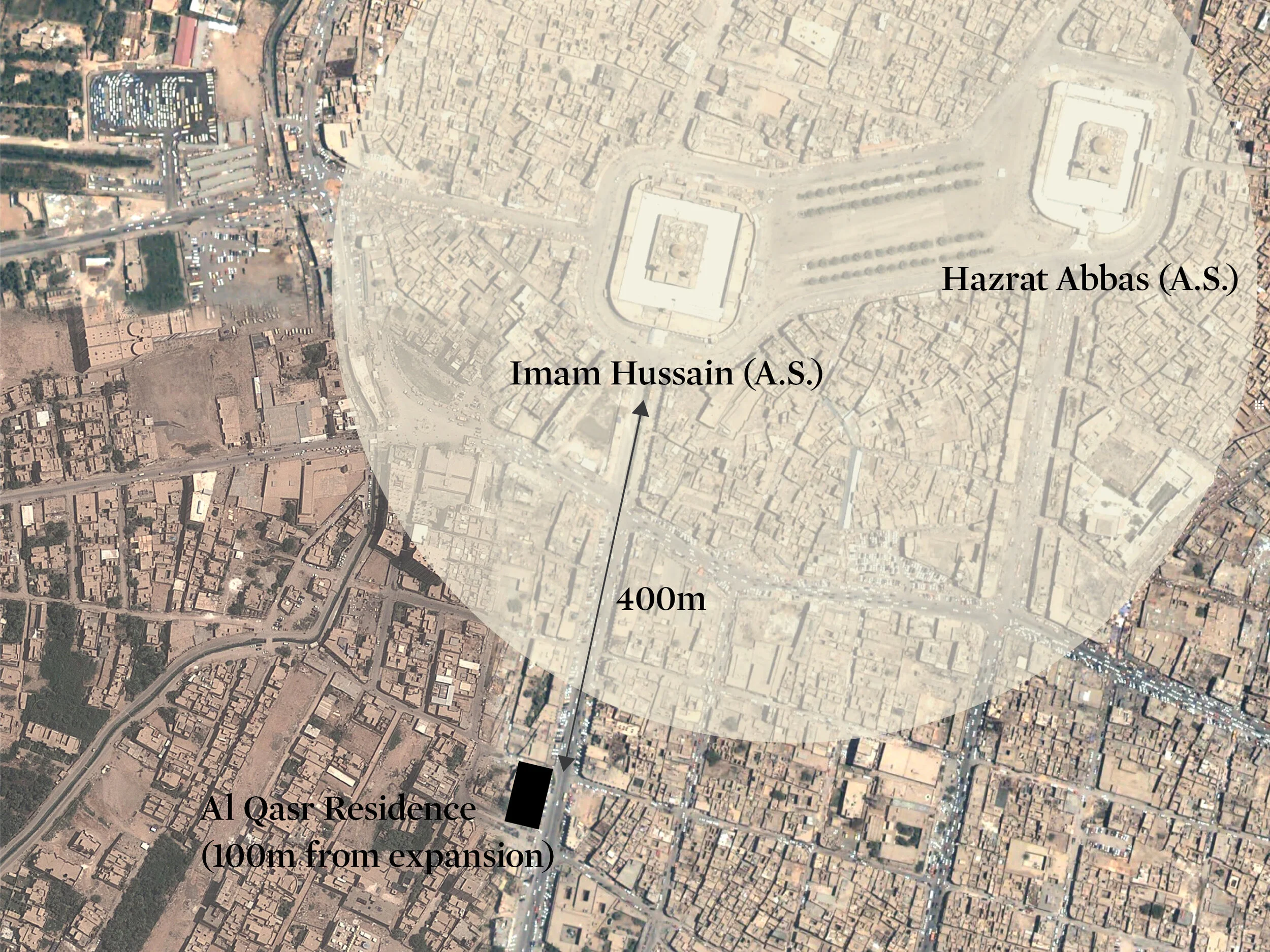 The site lies 400m from the Haram Shareef of Imam Hussain (A.S.) on the main road, and will only be 100m from the Haram complex once the 300m Karbala Haram expansion project is completed in a few years (Blue Zone).